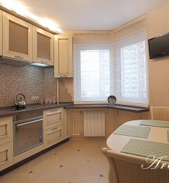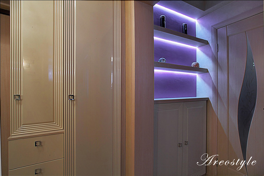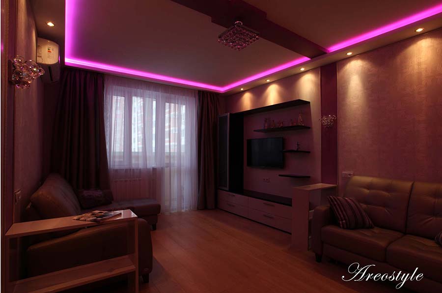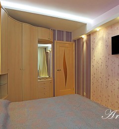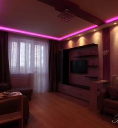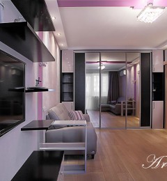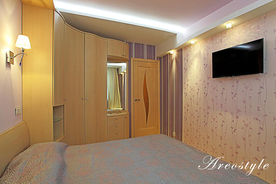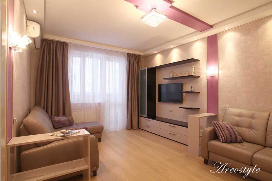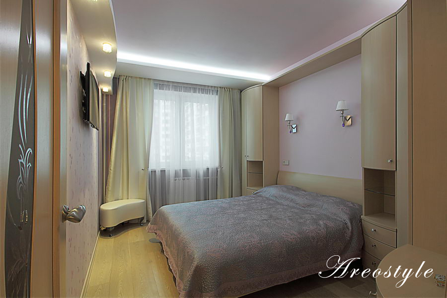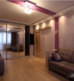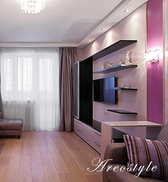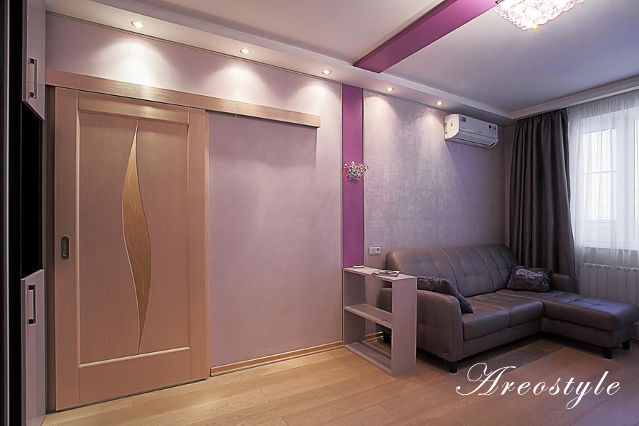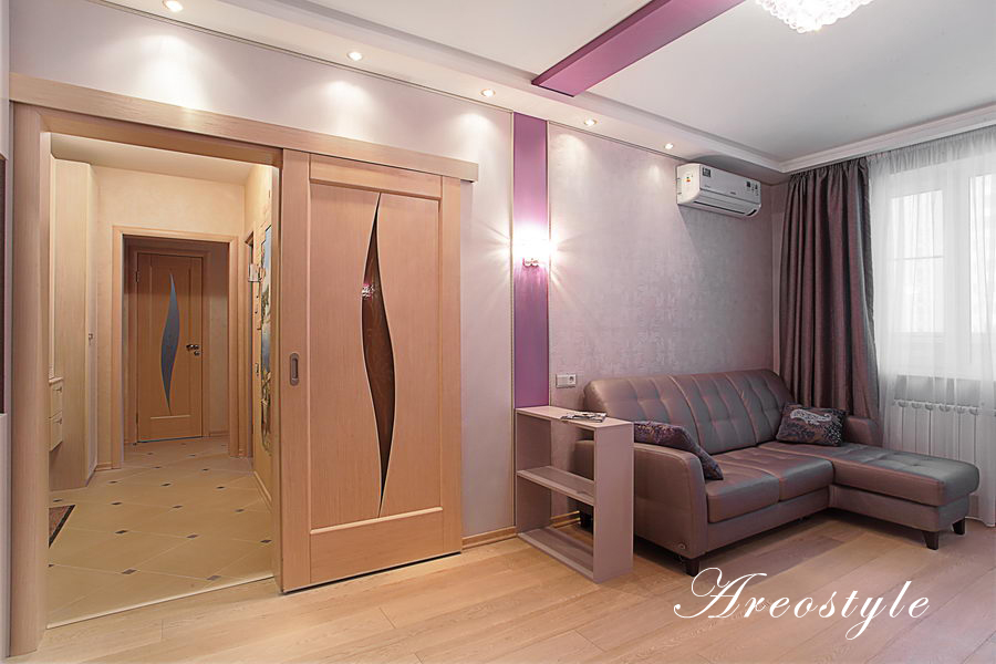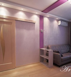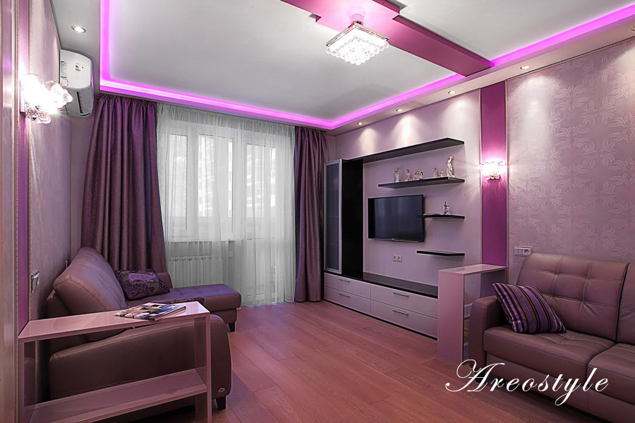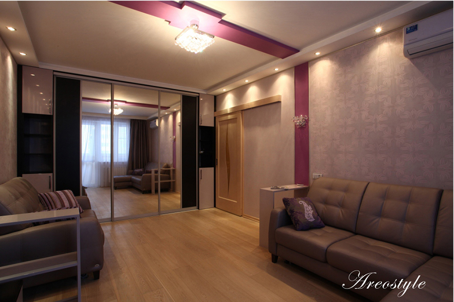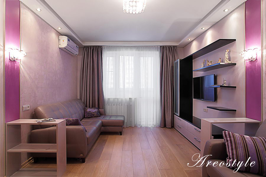 Двухкомнатная квартира 54 кв.м. в типовой серии П-44-Т. Хозяйка квартиры задала интересную задачу: сделать яркий, акцентный интерьер. Предусмотреть уютную спальню. Приемами декорирования создать гостиную комнату, не перегруженную мебелью, ипредусмотреть возможность размещения двух взрослых сыновей, приезжающих в гости. При этом гостиная должна была совместить функционал: зоны отдыха с телевизором, места для хранения небольшого количества вещей, стеллажей для книг, места для отдыха двух взрослых сыновей и рабочего места под компьютер.Таким образом, комната должна отвечать в разное время суток, различным потребностям семьи, оставаясь при этом презентабельным местом для приема гостей.