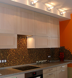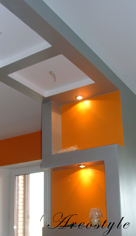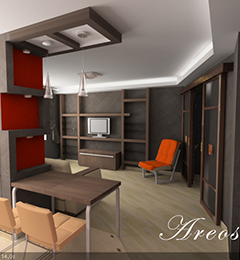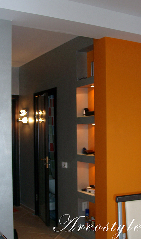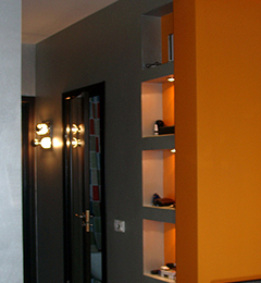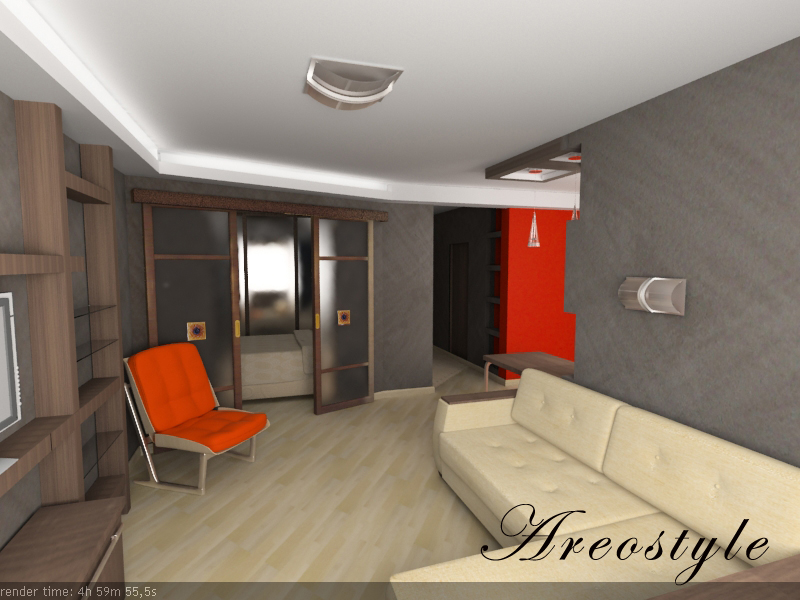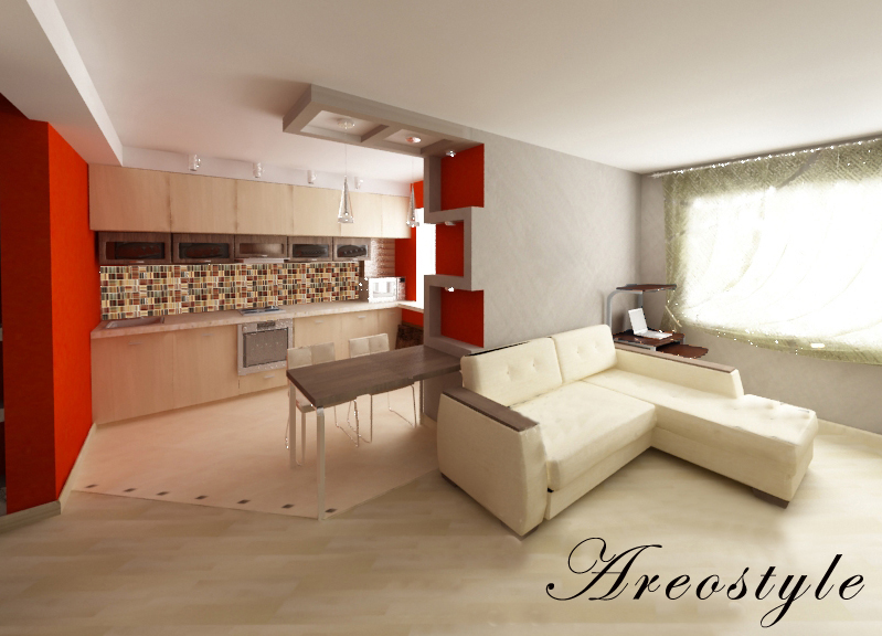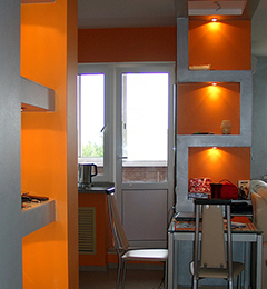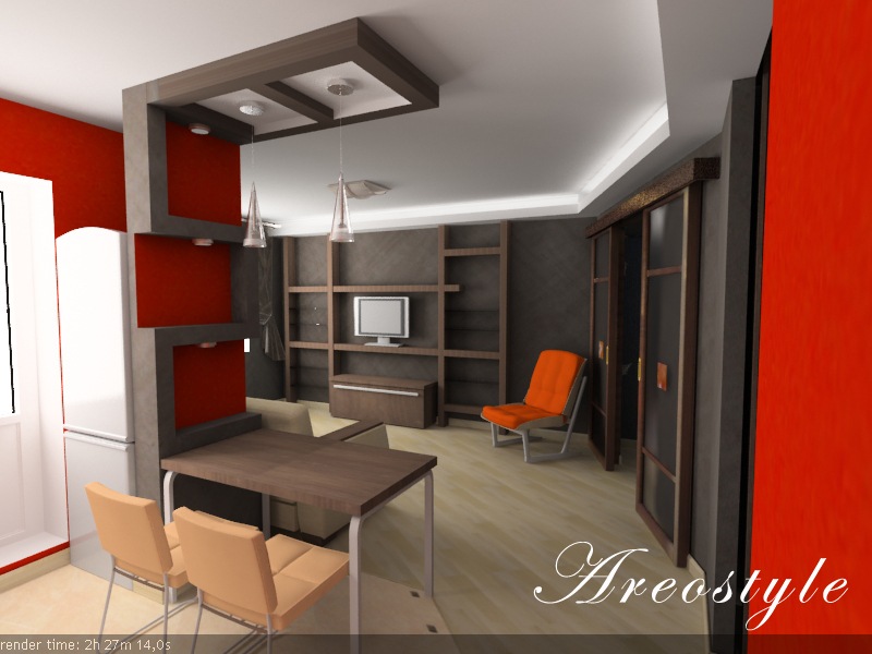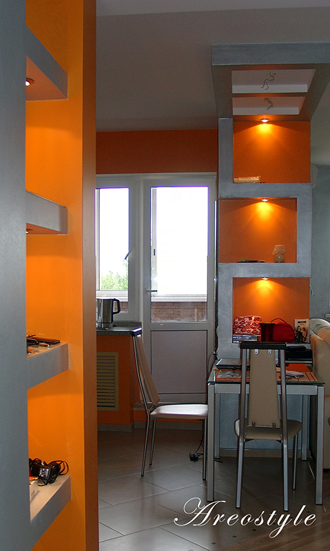 Дизайн однокомнатной квартиры-студии с открытой планировкой разрабатывался для молодой семьи. Задача была поставлена в однокомнатной квартире спланировать кухню гостиную и изолированную спальню, превратив тем самым квартиру в полноценную двушку. При реализации проекта применены методы зонированного освещения пространства, мобильные перегородки для организации спальни, яркие апельсиновые тона в интерьере, мебели и декоре, которые задали веселое и позитивное настроение квартире. Необходимый на кухне холодильник спрятан за гипсокартоновую выгородку с полочками, разработанную по индивидуальному дизайну. Именно эта перегородка стала фокусным центром интерьера